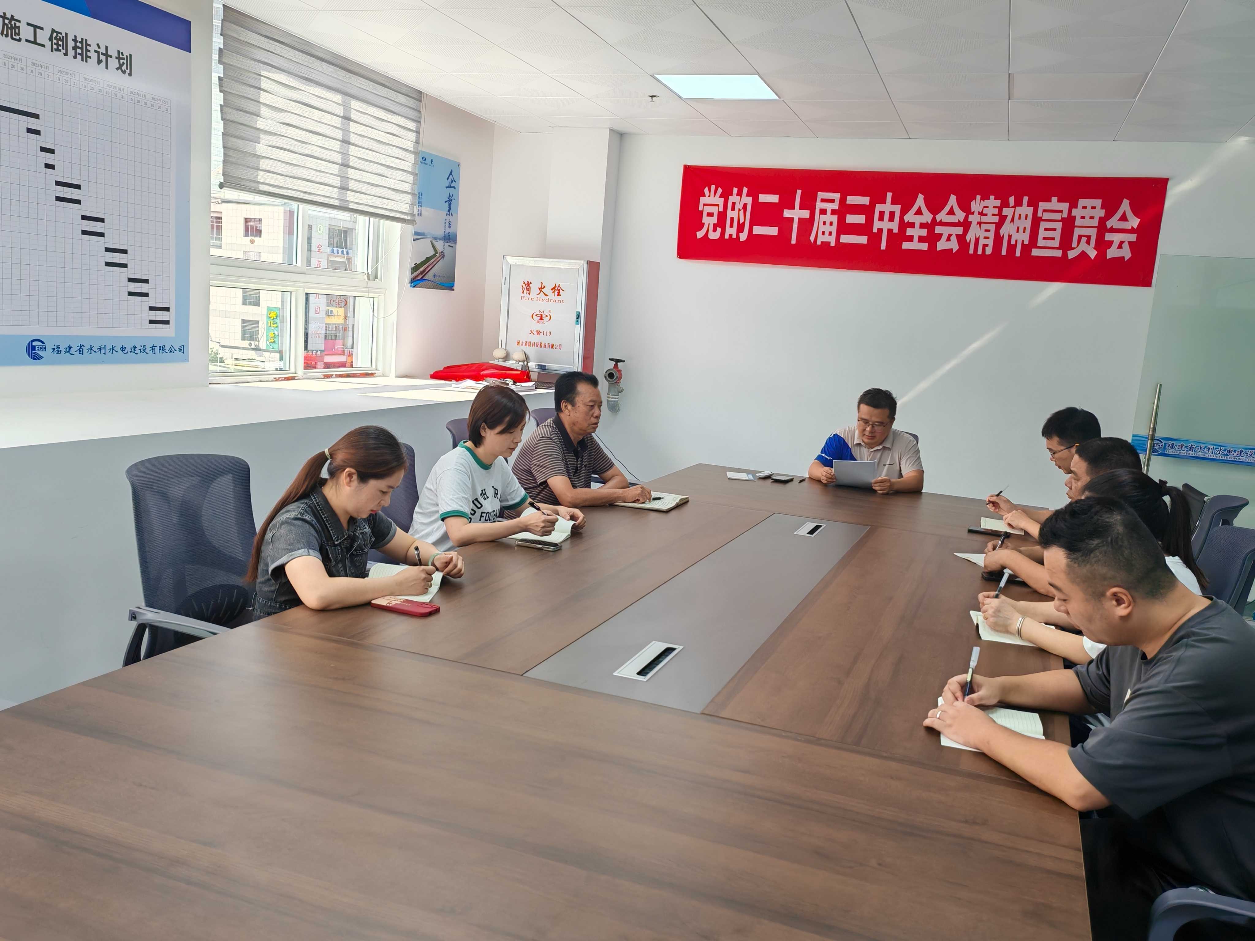 公司党支部把学习宣传贯彻党的二十届三中全会精神作为当前和今后一个时期的一项重大政治任务,坚持以上率下、整体联动,迅速掀起学习宣传贯彻党的二十届三中全会精神热潮。一是研究制定学习贯彻党的二十届三中全会精神实施方案,把学习党的二十届三中全会精神纳入“三会一课”,与巩固拓展主题教育成果、持续深化党纪学习教育、深化拓展“深学争优、敢为争先、实干争效”行动结合起来,推动全会精神在公司落地生根、开花结果。二是线上线下结合、本部与项目部同步,组织全体党员、中层及以上干部、项目负责人等参加省委党校教授陈新作《以经济体制改革为牵引,构建高水平社会主义市场经济体制——党的二十届三中全会精神解读》专题讲座学习。三是成立党的二十届三中全会精神宣讲队,9月13日,党支部书记颜华在公司本部为全体党员干部职工宣讲解读党的二十届三中全会精神;9月12日,支部委员黄炳周前往宁化城乡供水一体化项目部为项目人员宣讲全会精神;9月24日,支部委员林晞赴晋江防洪提升工程安溪段一期官桥双岭堤段工程现场宣讲全会精神;10月30日,公司支部副书记施建华深入周宁县城乡供水一体化项目开展学习贯彻党的二十届三中全会精神宣讲活动。确保党员干部群众自觉把思想和行动统一到全会精神上来,凝心聚力推动各项工作再上新台阶。